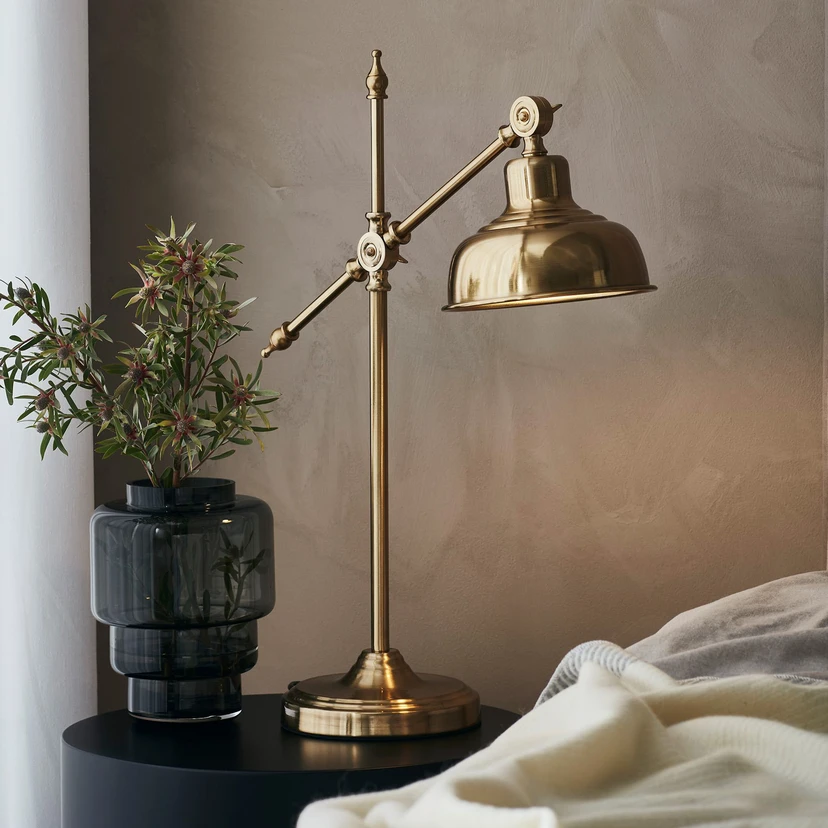 L'art de l'éclairage pour le salon : lampe à poser Grimstad en laiton antique Découvrez la lampe à poser Grimstad - un chef-d'œuvre d'éclairage qui séduit non seulement par sa finition en laiton antique, mais aussi par sa capacité à créer une atmosphère. Cette lampe en fer robuste est un complément élégant pour chaque salon, chambre à coucher ou bureau et promet de transformer l'ambiance de la pièce avec sa lueur chaleureuse. - Abat-jour et support avec articulations pour le réglage