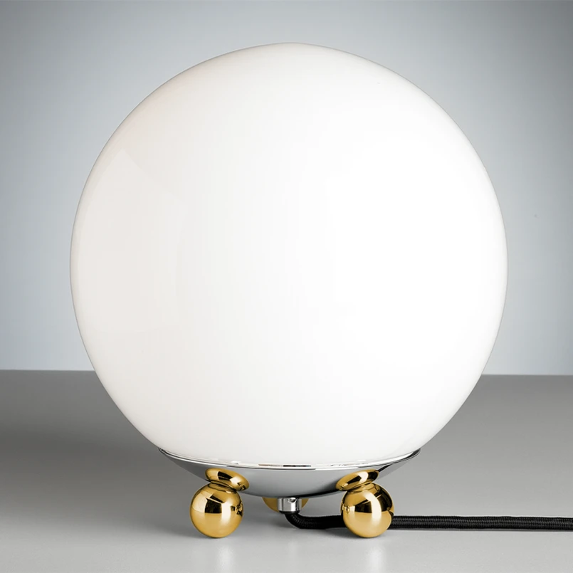 Le verre opale en forme de boule indémodable, supportée par un trépied à boules en laiton, au choix chromé, poli ou verni (zapon) de ce luminaire véhiculent complètement l'esprit Art Déco. Les matériaux procurent une lumière au coloris noble.