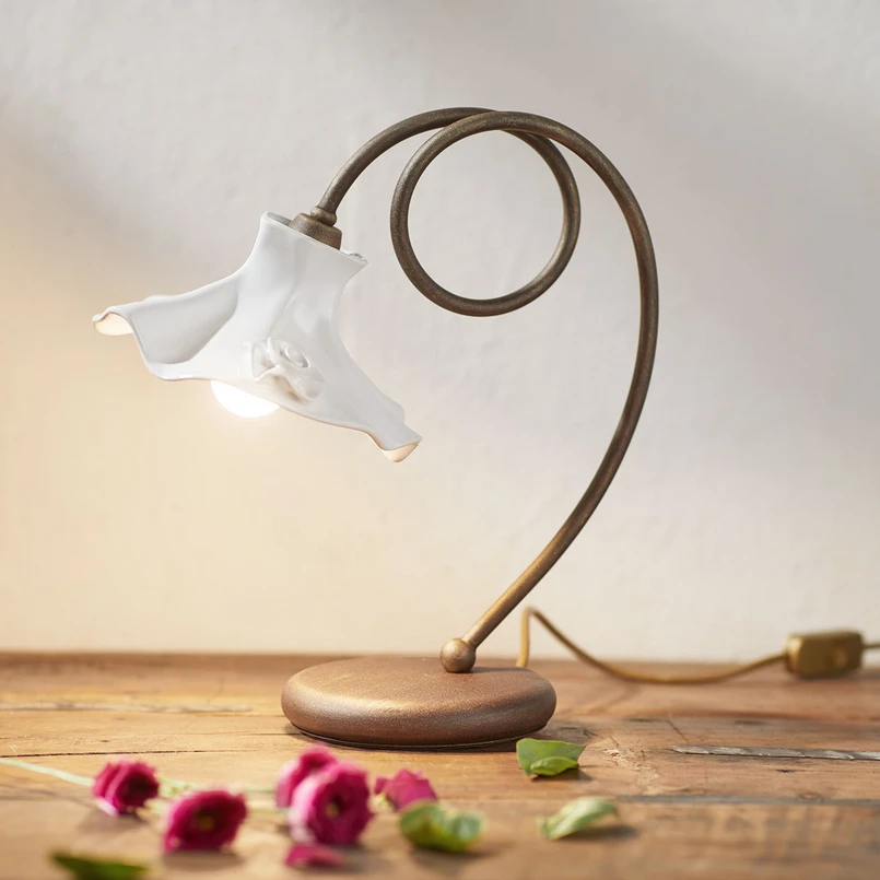 Cette lampe à poser séduira les amateurs de décors classiques et floraux qui se combinent de façon discrète mais manifeste en un luminaire qui trouvera aussi bien sa place dans un intérieur rustique que dans une résidence de style moderne, dans des chambres ou des réceptions d'installations hôtelières. Car partout où elle est installée, la lampe à poser Eleonora apporte non seulement un bon éclairage, notamment pour lire, mais également un élément de décoration qui attire l'attention et séduit par ses formes travaillées avec art. La céramique blanc brillant met joliment en valeur l'abat-jour ondulé orné d'une fleur, et la structure du luminaire dans une jolie finition rouille rustique évoque la tige de la fleur. La tige sort du socle de la lampe en formant des volutes dynamiques mais simples. Un élément de décoration robuste et novateur qui a du caractère et dont les coloris et les formes sont idéalement assortis !