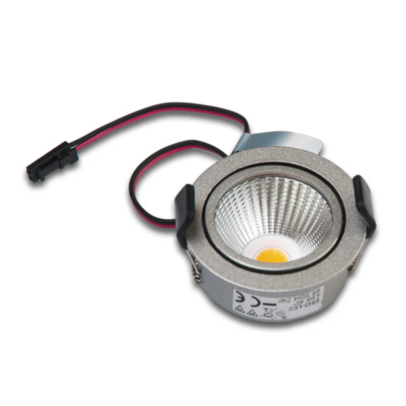 Luminaire LED encastré plat et orientable SR 45-LEDLe petit luminaire LED encastré SR 45-LED peut être installé dans des plafonds ou des meubles et nécessite une ouverture d'encastrement d'un diamètre de 4,5 cm. La profondeur d'encastrement dépend de l'épaisseur du panneau :Épaisseur du panneau jusqu'à 1,6 cm - profondeur d'encastrement 3,1 cmÉpaisseur du panneau 1,7 - 1,9 cm - profondeur d'encastrement 3,5 cmÉpaisseur du panneau 2,0 - 2,2 cm - profondeur d'encastrement 4 cmÉpaisseur du panneau 2,3 à 3,0 cm - profondeur d'encastrement 4,5 cm.Le luminaire LED encastrable d'une puissance absorbée de 4,8 W est en métal d'aspect inox et est livré avec un câble de raccordement de 0,2 m équipé d'une fiche LED 350. Un transformateur, à commander séparément, est nécessaire pour le raccordement. Le luminaire peut être orienté de 20°.