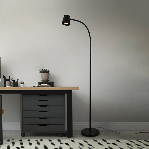 Lampadaire Skriva monochrome avec bras flexibleAu bureau ou plus généralement comme lampe de lecture, le lampadaire Skriva en métal convainc par sa lumière orientable. Cela est possible grâce au bras flexible dans la partie supérieure, qui supporte la tête en forme de cône tronqué. Équipé d'un interrupteur à pied sur le câble de la fiche.