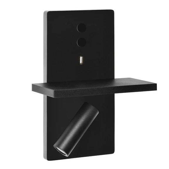 L'applique murale E-Lamp allie lumière indirecte et éclairage de lecture en un diffuseur de lumière moderne qui promet un éclairage d'appoint pratique à côté du lit, dans le coin lecture ou dans la chambre d'hôtel. Le boîtier rectangulaire en aluminium, orienté verticalement, abrite à l'arrière des LED blanc chaud dont la lumière éclaire indirectement la pièce par le biais du mur. Un spot cylindrique, pivotant à 180° et inclinable à 90°, est fixé à l'avant et offre un éclairage de lecture orientable. Au-dessus d'une tablette pour les petits objets d'usage courant, deux interrupteurs permettent de commander séparément les deux sources lumineuses, ainsi qu'une sortie de charge USB pour les smartphones, etc.