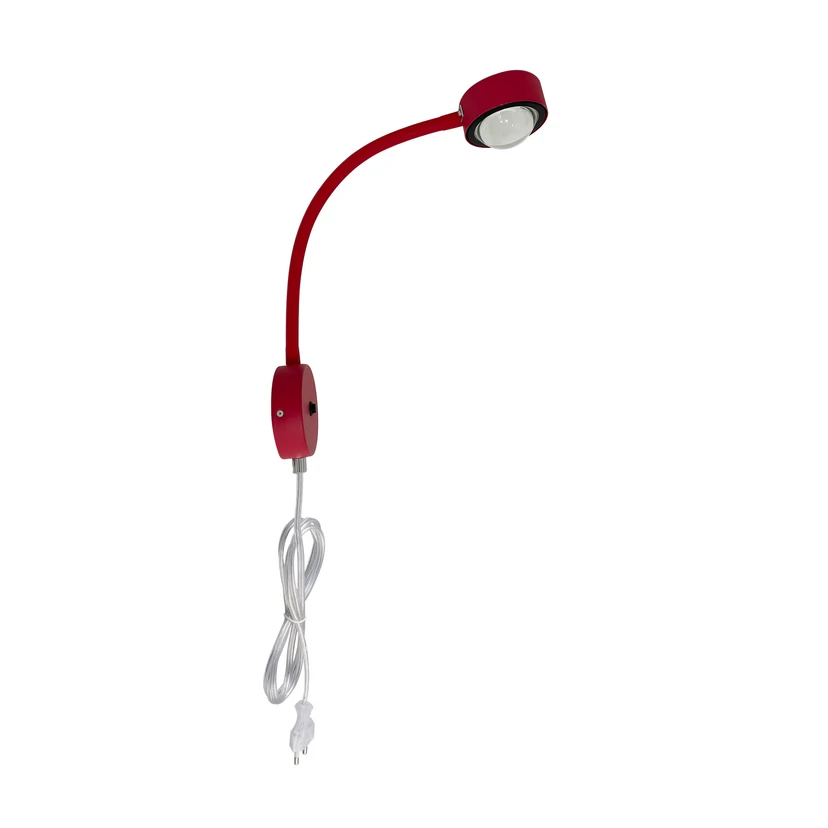 Applique murale Jyla avec bras flexible et variateur d'intensité variable intégré L'applique murale Jyla dispose d'une fiche, ce qui permet de la placer de manière flexible dans l'espace de vie. Pour l'utiliser, il suffit d'une prise de courant à proximité. Le bras flexible intégré est particulièrement pratique et permet d'adapter en un tour de main l'orientation de la lumière blanc chaud aux besoins personnels. Jyla est idéale comme diffuseur de lumière pour le bureau, le salon ou la chambre à coucher. Avec sa couleur rouge moderne, l'applique murale attire l'attention dans de nombreux environnements. Grâce à l'interrupteur intégré sur le support mural, il est possible d'allumer et d'éteindre la lampe comme d'habitude. Grâce à la technique de variateur d'intensité à 3 niveaux avec fonction off intégrée, il est en outre possible de faire varier l'intensité de l'éclairage sur trois niveaux différents en actionnant plusieurs fois l'interrupteur : 100 %, 50 % et 25 %. L'ampoule GX53 fournie est dotée d'une lentille bombée, ce qui lui donne l'aspect d'une demi-sphère en verre.