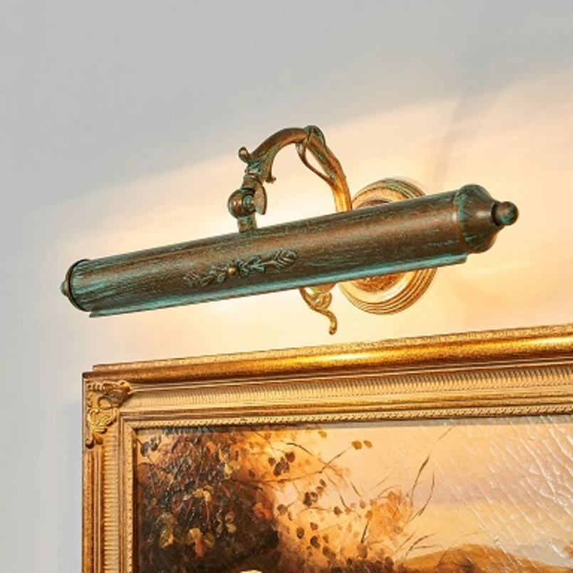 Applique pour tableau Kalea avec des détails intéressants sur l'abat-jour métallique Kalea est équipé de deux ampoules E14 et peut ainsi assurer un bon éclairage de l'image. Il peut s'agir d'un tableau ou d'un dessin, mais aussi d'une impression d'art ou d'une photographie. Comme la surface à l'aspect vert-de-gris a un aspect nostalgique et que le décor est plutôt ancien, l'applique pour tableau peut être combinée en premier lieu avec des styles d'habitation classiques, qui s'enrichissent alors d'un diffuseur de lumière stylé.
