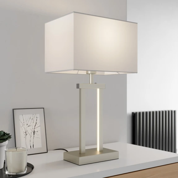 Lampe de table angulaire Sigurd avec deux sources lumineuses Sigurd est une lampe de table à l'aspect relativement moderne, composée d'une structure de couleur nickel et d'un abat-jour angulaire en tissu blanc. La douille à l'intérieur de l'abat-jour en tissu est équipée d'une ampoule E27 au choix et un autre point fort se trouve dans le support, comme on ne le soupçonne certainement pas au premier coup d'œil. L'armature de couleur nickel abrite en effet une source lumineuse LED qui contraste joliment avec la lumière douce derrière l'abat-jour en tissu. Les deux sources lumineuses peuvent être allumées séparément ou ensemble et l'intensité de l'ampoule LED peut même être réglée à l'aide d'un variateur à touche avec fonction mémoire (valable tant que l'alimentation électrique n'est pas interrompue et que la fiche reste dans la prise), tandis que l'interrupteur de l'ampoule E27 se trouve sous la douille - Source lumineuse LED : blanc chaud (3.000 K), 150 lumens