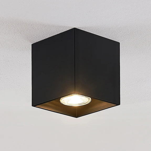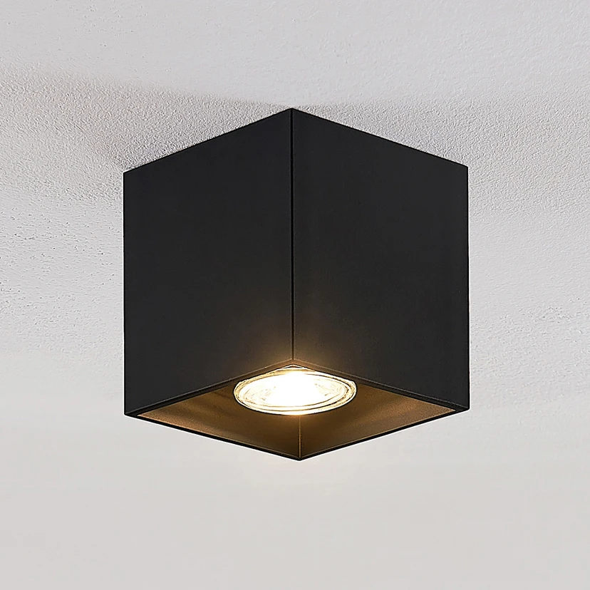 Parvin convainc avec son look épuré, car le plafonnier se compose essentiellement d'un cube compact en aluminium qui diffuse la lumière vers le bas. L'ampoule GU10 laisse un large choix : on peut donc aussi utiliser des ampoules LED économes en énergie et faire attention à l’angle de diffusion. En effet, certaines ampoules sont en forme de spot, alors que d'autres diffusent leur lumière plus largement. Ce luminaire peut être installé dans les environnements privés et commerciaux et sa surface noire n'est liée à aucun emplacement ou style particulier : Parvin est donc un bel élément polyvalent.
