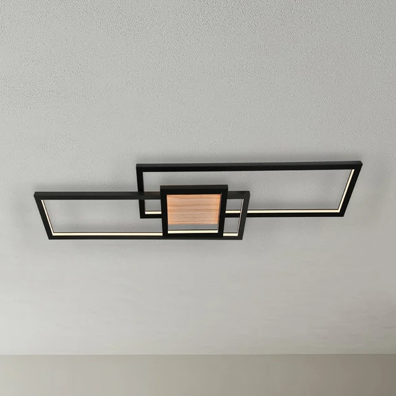Plafonnier LED angulaire Emiljan, coloris noir sable avec décor bois original