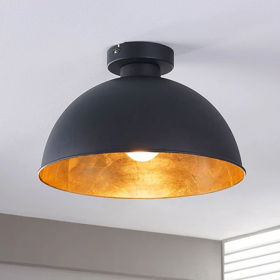 Lya - plafonnier attrayant avec extérieur noir et réflecteur intérieur doré Même si on ne le pense pas à première vue, les couleurs or et noir vont très bien ensemble, surtout lorsqu'il s'agit d'aménagements modernes. Avec cette combinaison de couleurs, on obtient un jeu de froideur distinguée et une lumière très chaude lorsqu'on l'associe à un éclairage. C'est également le cas du plafonnier Lya, dont l'abat-jour en forme de dôme a été peint en noir mat à l'extérieur et recouvert d'une feuille d'or mate à l'intérieur. De plus, un réflecteur se trouve à l'intérieur de l'abat-jour et bloque la lumière de la source lumineuse, créant ainsi une lumière principalement indirecte qui inonde la pièce de manière confortable. Lya convient comme diffuseur de lumière dans la chambre à coucher, mais peut bien sûr aussi être utilisé pour un éclairage accueillant du salon ou du couloir.