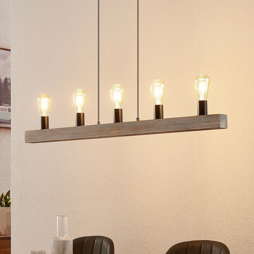 Le luminaire suspendu à faisceau Relia séduit par son design naturel, qui se caractérise parfois par une touche de modernité. La belle poutre en bois de pin attire le regard et donne tout de suite à la pièce un effet douillet. Cinq brûleurs sont placés en ligne sur la poutre.