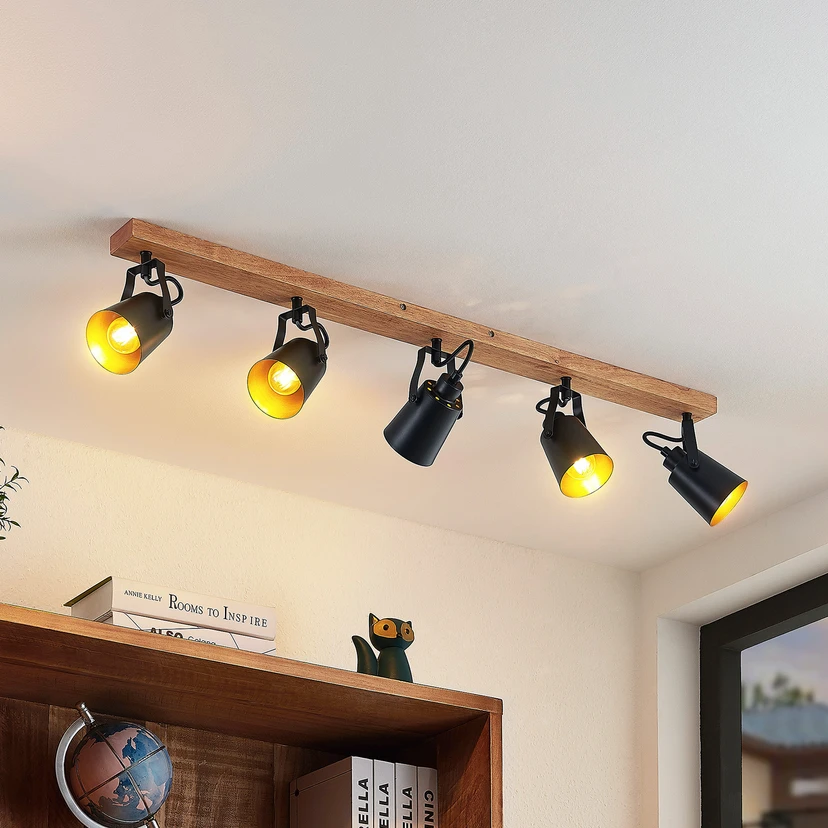 Spot pour plafond Kimban avec cinq abat-jour pour éclairer de grandes pièces Le spot pour plafond Kimban est un luminaire très particulier. Il possède une fixation au plafond en bois de caoutchouc foncé qui confère au design une note naturelle. Mais ce sont les cinq abat-jours en fer, noirs à l'extérieur et dorés à l'intérieur, qui sont au premier plan. Les abat-jours sont réglables, ce qui permet d'éclairer de manière ciblée et individuelle certaines zones de la pièce. Kimban, dans sa version à 5 lampes, est optimal pour les grandes pièces d'habitation, les couloirs ou les galeries.