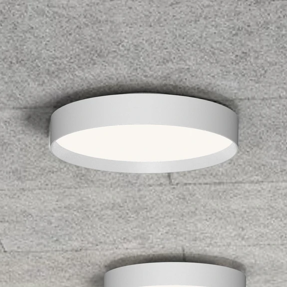 Plafonnier LED Lucia avec cadre rond et diffuseur prismatique Le design intemporel du plafonnier LED Lucia permet de le combiner avec de nombreux concepts d'aménagement, qu'ils soient classiques ou modernes, dans un environnement privé ou public/commercial. Un cadre étroit en aluminium, en forme de cylindre court, entoure le diffuseur plat. Ce dernier assure, grâce à sa structure microprismatique, une diffusion homogène de la lumière directe blanc chaud ; l'éblouissement et la formation d'ombres sont minimisés - bon rendu des couleurs : CRI > 90 - gradation externe (section de phase)
