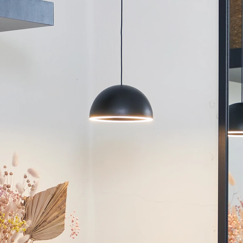 Suspension LED Curve moderne - conçue comme une demi-sphère La suspension LED Curve est un diffuseur de lumière au design moderne qui se prête à l'éclairage direct de table ou de zone. L'abat-jour en aluminium à la finition monochrome prend la forme d'une demi-sphère ouverte en bas ; des LED sont intégrées au bord inférieur et diffusent une lumière blanche chaude avec un bon rendu des couleurs (CRI 90). Si nécessaire, la luminosité peut être réglée de l'extérieur à l'aide de variateurs d'intensité variables TRIAC.