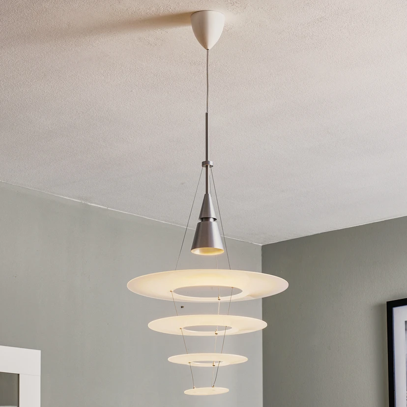 L'abat-jour est un cône d'aluminium brossé tourné vers le bas. En dessous sont suspendus quatre anneaux disposés horizontalement dont les ouvertures de plus en plus petites filtrent progressivement la lumière. Le matériau fin est légèrement translucide et mat sur le dessus, tandis que les dessous brillants reflètent la lumière. Le résultat est un éclairage ambiant doux. De plus, les anneaux eux-mêmes sont accentués et apparaissent comme des éléments flottants.