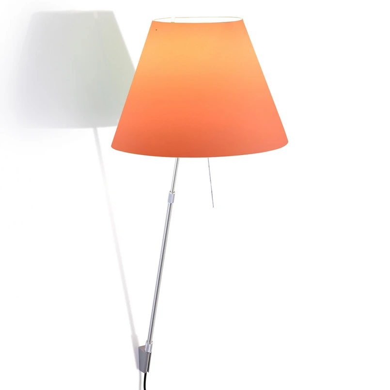 La lampe murale Costanza est dans sa conception basée sur les lampes de table et de sol classiques : Bâton avec ombre. La tige de la lampe murale est également équipée d'un bras télescopique qui permet de régler la lampe en hauteur de 76 à 110 cm. L'abat-jour de forme conique est en polycarbonate et a été sérigraphié. À l'extrémité inférieure de l'abat-jour, une petite tige dépasse, qui sert à allumer et à éteindre ainsi qu'à varier l'intensité lumineuse (en quatre étapes).