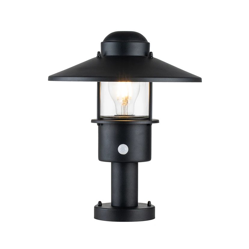 Lampe de socle Klampenborg de style scandinave La lampe de socle Klampenborg s'harmonise visuellement avec de nombreux aménagements de terrain. Il est fabriqué en acier inoxydable 304 et est revêtu d'une peinture en poudre noire pour une durabilité encore plus longue. Klampenborg est équipé d'un détecteur de mouvement qui n'allume la lumière que lorsqu'elle est nécessaire. La lumière de la lampe utilisée est diffusée tout autour à travers le verre transparent et éclaire l'environnement de manière évocatrice.