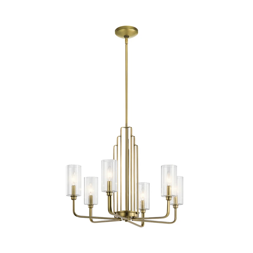 Kimrose - lustre à six flammes de style Art déco Le lustre à six flammes Kimrose est un véritable accroche-regard dans chaque pièce. Sa structure en acier à l'aspect laiton brossé lui confère une touche de noblesse et les abat-jour en verre strié clair créent un bel effet de lumière. La particularité de ce lustre est que les abat-jour en verre peuvent être retirés, ce qui permet un nettoyage facile et offre en outre la possibilité de changer le look du lustre. Un autre point fort est la possibilité de gradation externe qui permet un réglage individuel de la luminosité et assure ainsi une atmosphère agréable dans la pièce. Que ce soit dans le salon, la salle à manger ou la chambre à coucher, le lustre Kimrose est un véritable bijou qui met en valeur chaque ambiance.
