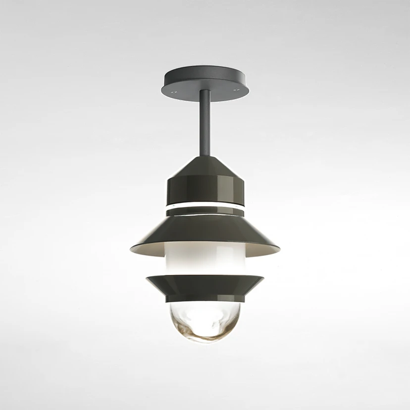 Plafonnier d'extérieur Santorini en forme de lanterne avec abat-jour variable, IP65 Polyvalent, moderne et robuste, le plafonnier d'extérieur Santorini est conçu pour une ampoule E27 vendue séparément. Grâce à son indice de protection IP élevé, il est étanche à la poussière et protégé contre les jets d'eau, ce qui lui permet de diffuser de la lumière à l'extérieur avec style. Grâce à son apparence soignée, elle fait également office d'élément décoratif, même lorsqu'elle est éteinte. Le corps en verre soufflé et pressé à la bouche est soutenu par un support en métal. Les deux abat-jours et l'entretoise en polycarbonate peuvent y être fixés de différentes manières afin de créer le mélange de lumière directe et indirecte souhaité. Le design de Santorini s'inspire des lanternes utilisées sur les bateaux de pêche et a été créé en 2015 par le jeune studio de design Sputnik de Valence, composé de quatre personnes.