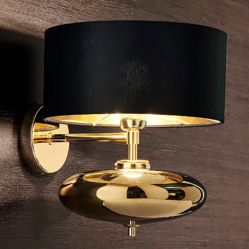 Mélange de matériaux - applique murale Show Ellisse en noir et or Avec l'applique murale Show Ellisse, on obtient un superbe accroche-regard. Sa belle forme combinée aux couleurs expressives noir et or orne tout simplement chaque mur. L'abat-jour en textile noir laisse passer la lumière de manière discrète, de sorte que la lumière est dans ce cas plus diffusée vers le haut et vers le bas. Sous l'abat-jour se trouve un verre doré qui est éclairé par la lumière. Elle est ainsi merveilleusement mise en valeur.