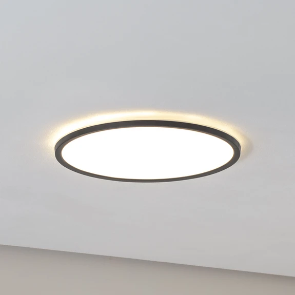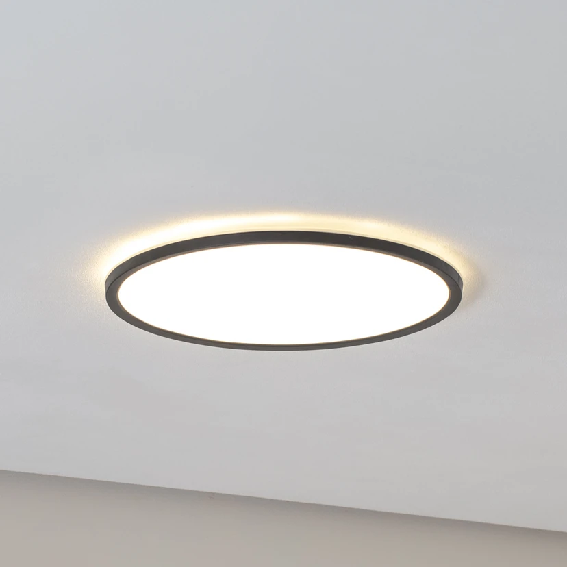 Panneau LED rond Aqua pour salle de bains, avec cadre noir Le plafonnier LED Aqua est un panneau plat de forme ronde. Le diffuseur en plastique satiné garantit une émission de lumière sur une grande surface et est entouré d'un cadre métallique noir. Grâce à la protection IP54, Aqua peut être utilisé sans problème dans les salles de bain et les salles de sport - température de couleur de la lumière réglable avant la mise en service (3 000 K / 4 000 K / 6 500 K) - intensité variable : actionnement de l'interrupteur mural par courtes séquences
