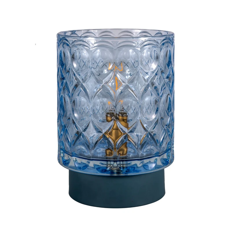 Lampe de table LED à piles Chic Glamour avec abat-jour en verreAvec son verre esthétique bleu glacier, la lampe de table Chic Glamour assure une lumière agréable dans le salon ou la chambre à coucher. La structure élégante du verre et le pied de lampe en métal font de cette lampe de table un point fort de la décoration. Placée harmonieusement dans chaque pièce à vivre, elle crée une fantastique atmosphère lumineuse. Le fonctionnement sur piles te permet de placer la lampe de table mobile partout et toujours différemment - indépendamment de la présence d'une prise de courant à proximité. Grâce à la minuterie de 6 heures, la lampe de table s'éteint automatiquement. Notre conseil : sur les grandes tables, comme celle de la salle à manger, plusieurs de ces lampes placées côte à côte sont du plus bel effet. Remarque : Veuillez noter que les piles ne sont pas incluses (3 x AA).