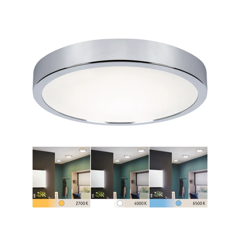 Le plafonnier rond à LED Aviar est équipé de la fonction WhiteSwitch. Cette technologie permet de changer la couleur de la lumière en trois étapes, simplement à l'aide d'un interrupteur mural classique. Le plafonnier peut ainsi soutenir le biorythme naturel du corps, par exemple en fournissant la lumière du jour le matin, une lumière blanche universelle pour le maquillage et une lumière blanche chaude le soir pour la détente.