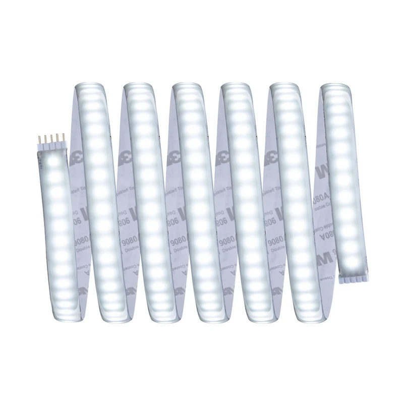 Avec une longueur de 2,5 mètres et des LED puissantes, cette rallonge de la gamme MaxLED de Paulmann peut même servir de source de lumière principale dans la pièce. Un mètre de MaxLED 1000 brille aussi fort qu'une lampe à incandescence classique de 75 watts. Avec une protection IP44, MaxLED est même conçu pour être utilisé dans des pièces humides et à l'extérieur. Ceci est assuré par un revêtement spécial qui protège contre la poussière et les projections d'eau. La bande d'extension ne peut être utilisée qu'avec l'ensemble de base correspondant, y compris le transformateur. Le plastique utilisé est flexible, ce qui permet de fixer la bande sur des surfaces planes ou irrégulières. L'ensemble de base est disponible en tant qu'accessoire.