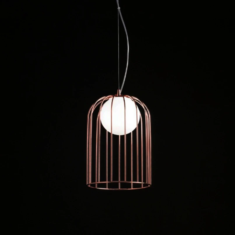 Kluvi - Suspension design avec cage métallique cuivrée Au-dessus du comptoir d'une cuisine ou dans le salon pour éclairer le coin salon - la suspension Kluvi avec sa cage métallique cuivrée brillante en guise d'abat-jour peut être utilisée de multiples façons, y compris dans le domaine de la gastronomie. L'ampoule (une ampoule halogène G9 - non incluse) se trouve dans la boule en verre soufflé à la bouche et blanc laiteux qui est placée en haut de la cage métallique. Kluvi est une suspension design qui respire la modernité et permet d'obtenir un éclairage agréable sans éblouissement.