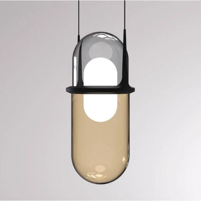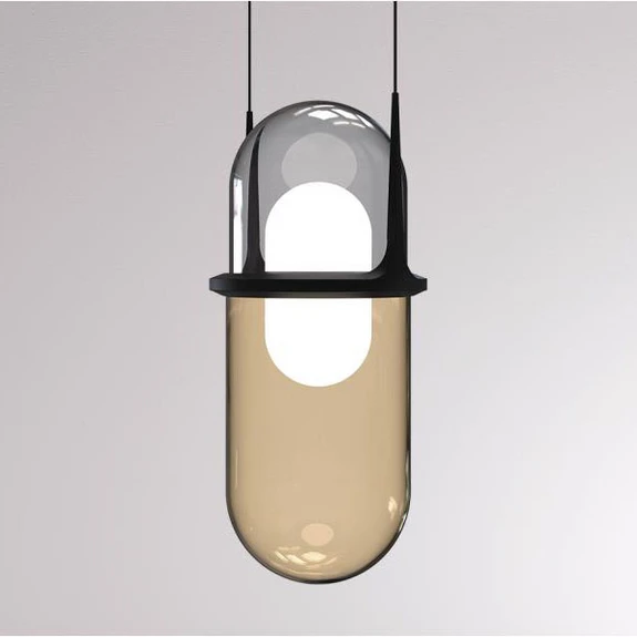 Suspension LED Pille arrondie avec abat-jour en verreLa suspension LED Pille en forme de capsule se compose d'un abat-jour en verre coloré soufflé à la bouche à l'extérieur et d'un verre opale à l'intérieur, ainsi que d'un support et d'une suspension noirs. Grâce au verre fumé très tendance, la lumière sort directement et peut rayonner dans toutes les directions imaginables de la pièce. En outre, le verre permet également de refléter l'environnement. Le verre blanc opalin à l'intérieur garantit un rayonnement uniforme et un éclairage sans éblouissement. Les LED blanc chaud ont un très bon rendu des couleurs avec un indice de rendu des couleurs de Ra >90, de sorte que tous les objets de la pièce apparaissent très fidèlement. Avec le design de la suspension LED Pille, le fabricant a combiné un sens très particulier de la tendance et du design dans un seul luminaire, ce qui est prouvé par le choix des couleurs, le design unique et tendance du verre fumé et la technologie LED à haute efficacité énergétique.