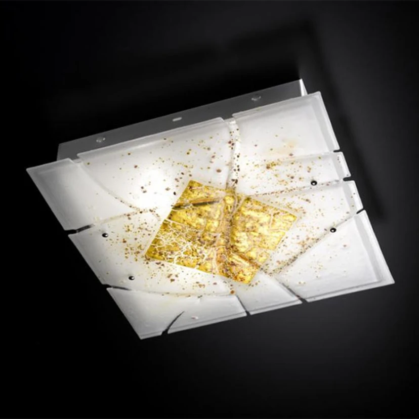 Le plafonnier design Frame crée une ambiance distinguée Frame est fabriqué en verre fondu, qui réunit des éléments transparents et blancs. Le noble abat-jour est orné de petits flocons intégrés dans le verre. Mais c'est le magnifique décor en feuille d'or qui donne au plafonnier son éclat le plus complet. Il se met à scintiller comme par magie dès que la lumière s'allume et confère à l'espace de vie une élégance distinguée.