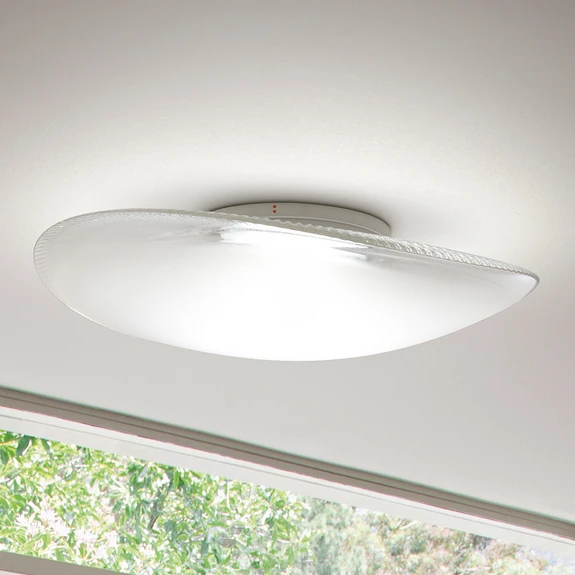 Gracieux luminaire LED design Loop avec abat-jour en verre incurvéL'abat-jour du plafonnier en verre Loop, conçu par la designer Constance Guisset, ressemble à la jupe volante d'une danseuse en mouvement. Le plafonnier est léger et aérien et son bord intérieur en verre rainuré produit un effet de lumière. L'abat-jour est principalement en verre transparent, il a été sablé uniquement vers le bas, ce qui permet une bonne répartition de la lumière et évite l'éblouissement.Le fabricant italien de ce plafonnier se distingue par des produits de haute qualité qui promettent un plaisir de la lumière au plus haut niveau et sont largement reconnus dans le monde entier. L'Australie, l'Inde, la Nouvelle-Zélande, la Turquie, le Danemark et l'Isral sont quelques-uns des pays dans lesquels Fabbian Illuminazione distribue ses luminaires de haute qualité.