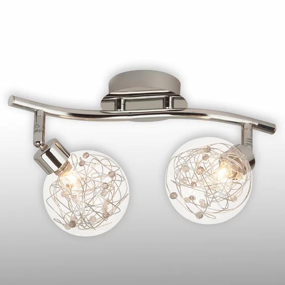 Le support au plafond légèrement courbé porte deux abat-jour joliment conçus en verre transparent qui enferment un lacis métallique et des éléments décoratifs en verre au reflet rougeâtre. Ils peuvent être orientés grâce aux articulations au niveau de la fixation. Le plafonnier Joya offre un éclairage plein d’effets et peut être équipé d’ampoules halogènes G9 qui mettront bien en valeur les éléments décoratifs à l’intérieur des sphères en verre transparent. (Les ampoules doivent être commandées séparément - voir rubrique accessoires.)