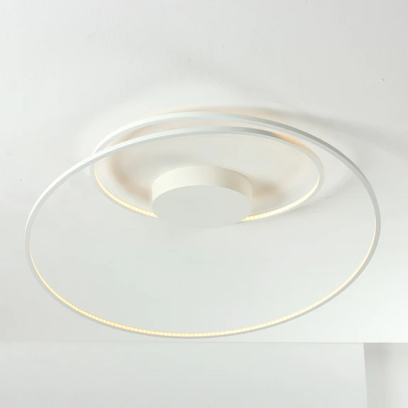 Remarquable plafonnier At en métal blanc avec une forte puissance lumineuseAvec son diamètre de 70 cm et son design unique qui rappelle l'élément important des adresses Internet, le signe @, le plafonnier à LED At en métal blanc attire le regard dans chaque pièce et séduit par sa sobriété et sa puissance lumineuse particulièrement élevée. La gracieuse spirale métallique abrite une bande LED avec rayonnement lumineux vers l'intérieur qui, avec une puissance absorbée de 33 W, atteint un flux lumineux fabuleux de 5.030 lumens. La lumière d'une couleur blanc chaud confortable de 2.700 kelvins peut être réglée en intensité à l'aide d'un variateur externe (variateur non inclus). Le plafonnier At est un produit de qualité qui provient de la maison BOPP-Leuchten - un fabricant de luminaires établi dans l'Odenwald, qui a plus de 100 ans d'expérience dans la fabrication de luminaires et est connu pour ses produits de haute qualité.