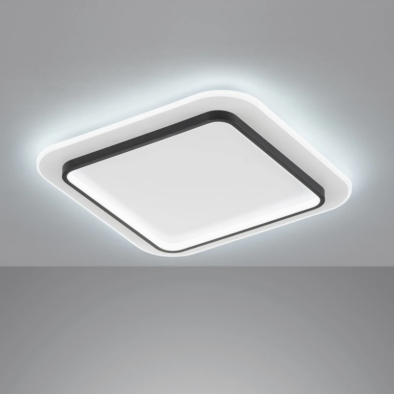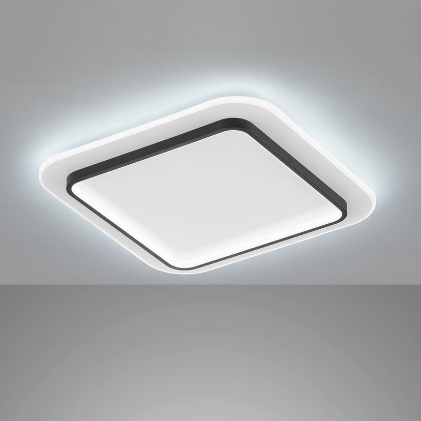 Plafonnier LED Blithe, intensité lumineuse variable via l'interrupteurLe plafonnier LED Blithe carré en blanc avec cadre noir assure un éclairage de base blanc chaud dans chaque pièce. La particularité de ce luminaire est qu'il est possible de le faire varier via l'interrupteur d'éclairage existant. En appuyant plusieurs fois sur l'interrupteur, il est possible de faire varier l'intensité lumineuse du luminaire sur trois niveaux.