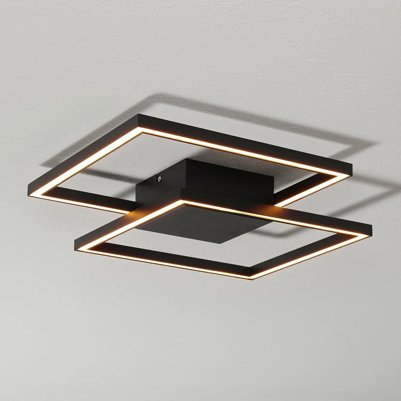 Avec son design carré, le plafonnier LED Falcon donne une touche moderne à l'espace de vie. Falcon se compose de deux carrés qui se chevauchent et dans l'intersection desquels est placé le baldaquin. Les montures métalliques noires sont entièrement recouvertes de LED intégrées et orientées vers le bas. Celles-ci offrent un éclairage direct pour la zone située en dessous, comme par exemple la table du salon ou de la salle à manger.