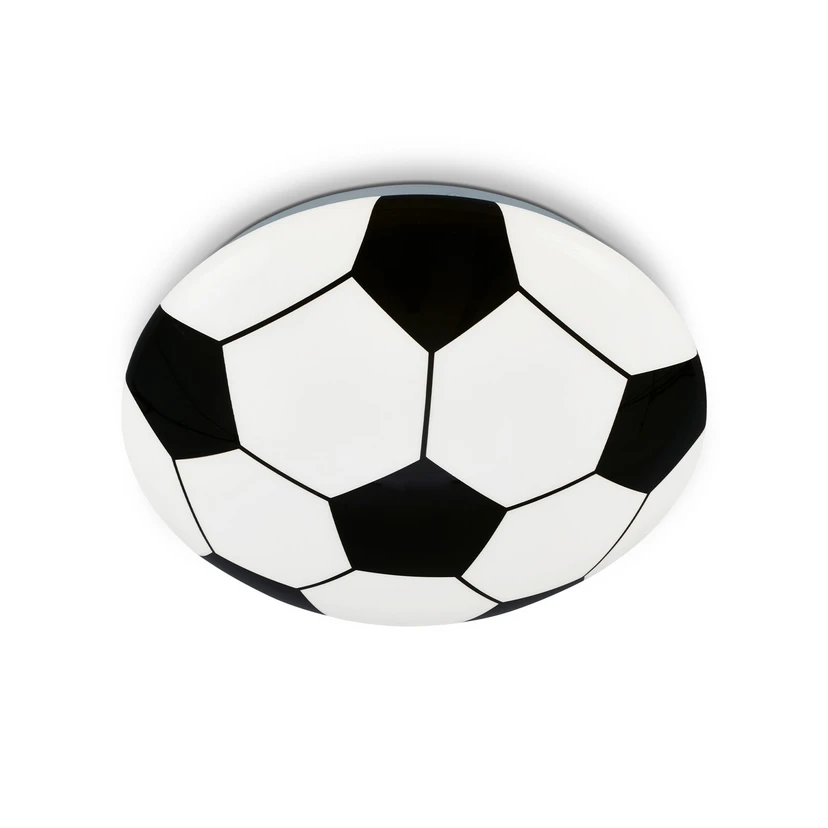 Plafonnier LED Football - un puissant diffuseur de lumière pour les chambres d'enfants et d'adolescents Ce plafonnier LED est équipé d'un diffuseur rond en plastique, orné d'un motif de football noir et blanc. À l'intérieur, un module LED à rayonnement blanc universel est intégré, dont la lumière souligne encore le motif du plafonnier et assure un éclairage général efficace.