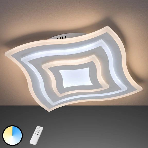 Plafonnier LED blanc Gorden Le plafonnier LED Gorden impressionne par son design esthétique et sa finesse discrète. Grâce à son fonctionnement intuitif et simple ainsi qu'à son aspect intemporel dans un blanc charmant, il constitue un complément élégant aux concepts d'éclairage les plus divers. Le luminaire prend peu de place et trouve ainsi sa place dans de nombreux espaces de vie et environnements d'éclairage. L'intensité lumineuse et la température de couleur du luminaire LED, économe et efficace en énergie, peuvent être réglées individuellement. De plus, il enrichit son environnement avec son design blanc en forme de losange, au style séduisant et légèrement ludique.