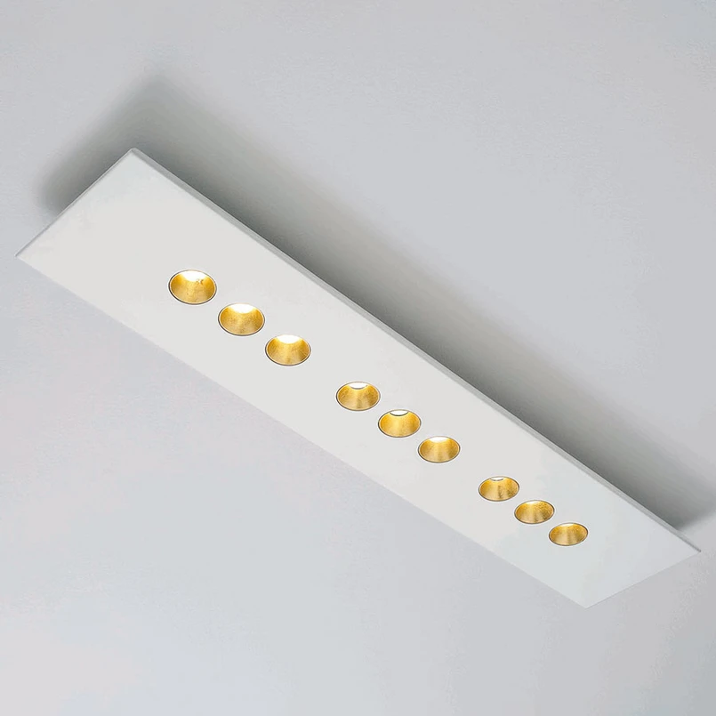 Confort - un design italien moderne aux formes clairesLe plafonnier LED Confort provient de la maison Icone, une entreprise connue pour ses luminaires minimalistes aux formes claires. Le luminaire Confort ne fait pas exception à la règle. Il se compose d'un corps en aluminium de haute qualité, laqué blanc mat, de forme rectangulaire allongée. La lumière, sous forme de LED de haute qualité, est ici logée dans neuf réflecteurs constractants en forme d'entonnoir. Les LED à faible consommation d'énergie diffusent leur lumière vers le bas, pratiquement sans éblouissement. Le plafonnier LED Confort s'intègre ainsi dans tous les styles d'aménagement modernes et contemporains. Il peut être installé au choix individuellement, mais aussi en groupe au plafond ou au mur. Que ce soit dans le salon, le bureau ou le couloir, son design discret mais esthétique s'intègre partout.