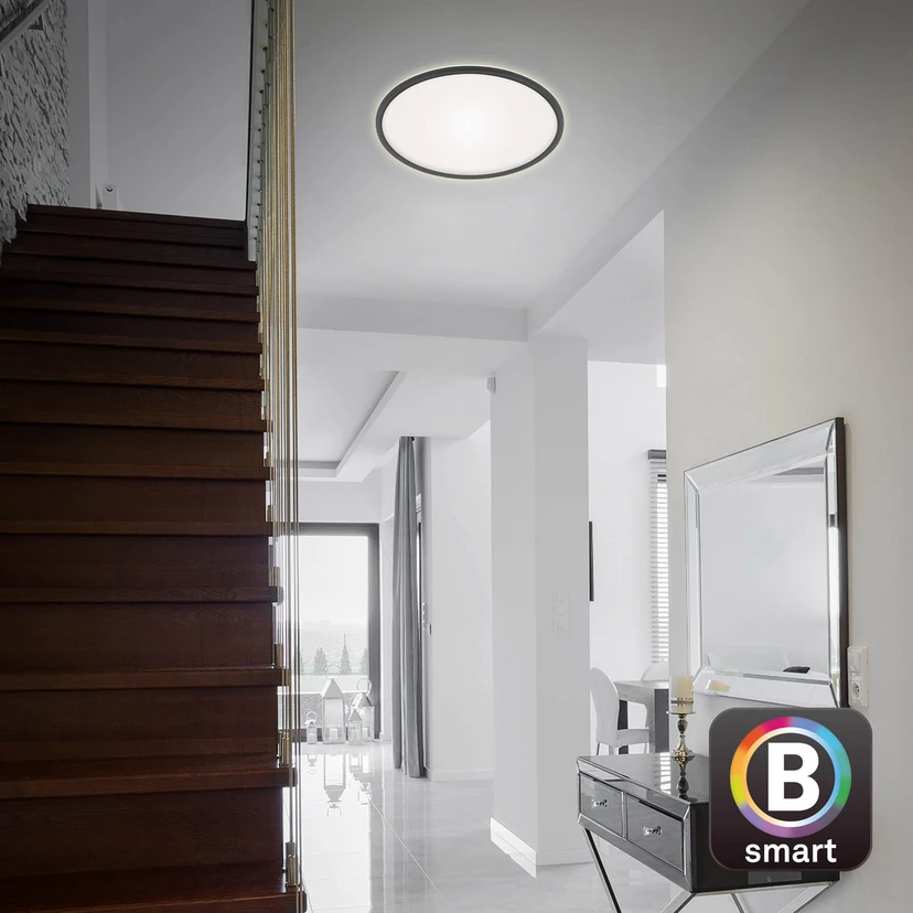 Plafonnier LED Slim à commande intelligente avec effet rétroéclairé et fonction de mémorisationLe plafonnier LED Slim se présente comme un luminaire fonctionnel et tendance. Les LED intégrées sont réparties uniformément derrière la surface lumineuse blanche et la température de couleur peut être modifiée entre un blanc chaud confortable et un blanc lumière du jour intense. De plus, l'intensité lumineuse peut être modulée en continu afin d'obtenir la sortie lumineuse adaptée à chaque situation, que ce soit pour un dîner confortable ou une soirée de jeux passionnante.En plus d'une fonction minuterie et d'une fonction veilleuse, le Slim est également équipé d'une fonction mémoire qui permet d'enregistrer le dernier réglage de la lumière. Le rétroéclairage intégré, qui projette une lumière douce au plafond et rend chaque pièce encore plus confortable, crée une atmosphère particulière. La Slim est une source de lumière originale, notamment pour la création d'un concept d'éclairage et d'espace original, dont toutes les fonctions peuvent être commandées par la télécommande fournie, par commande vocale ou par téléphone portable. - contrôlable via l'application WiFi (gratuite pour iOS et Android)- compatible avec Google Home et Amazon Echo pour une commande vocale intelligente- les couleurs de lumière et la luminosité peuvent être adaptées via l'application