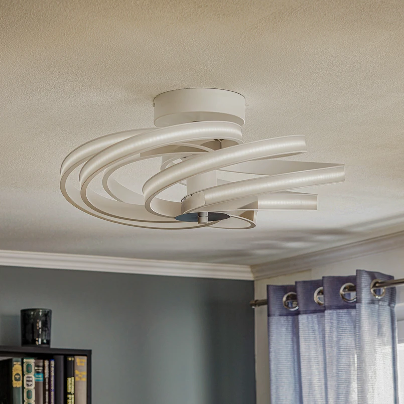 Un élan moderne - plafonnier LED Zoya en blanc Avec son caractère lumineux et son design dynamique, le plafonnier LED Zoya enrichit les espaces de vie modernes. Le support central est entouré de bandes métalliques incurvées en spirale, dont les côtés extérieurs disposent de bandes LED intégrées. Cela permet d'obtenir un éclairage efficace de tous les côtés.
