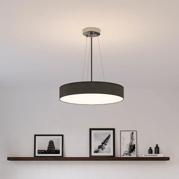 Plafonnier rond Mia Le plafonnier moderne et sobre Mia est équipé d'un étroit abat-jour textile rond avec cache, qui assure une lumière agréable et non éblouissante dans le salon ou la chambre à coucher. Avec une suspension vendue séparément, le luminaire peut également être monté en suspension.