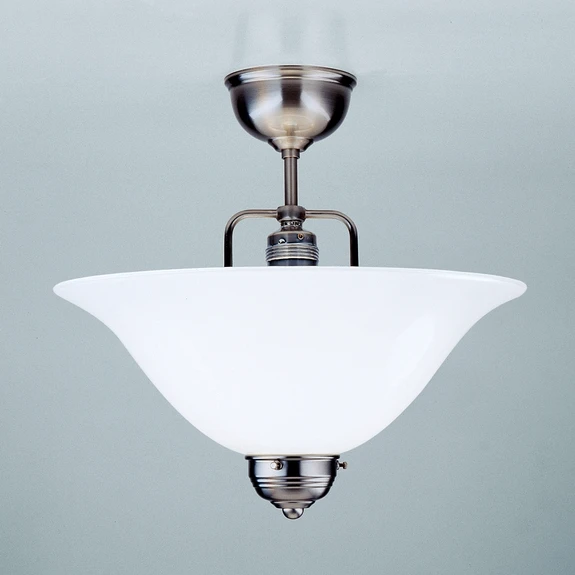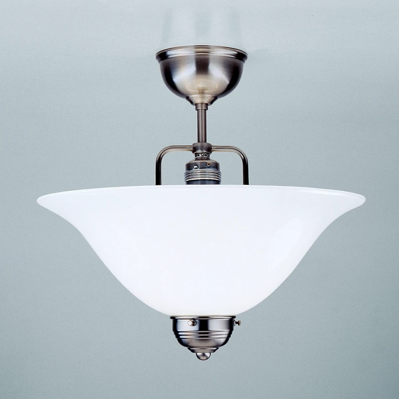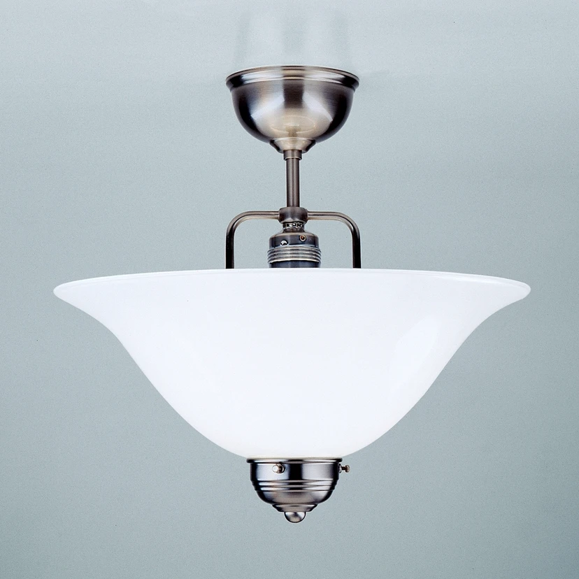 Plafonnier en nickel ROSA avec suspension courte Le plafonnier ROSA a été créé sur la base d'anciens modèles datant des années 1900. Elle est fabriquée à la main en utilisant principalement des pièces en laiton pur. L'abat-jour en verre overfang est soufflé à la bouche. Le support est nickelé mat. Après le nickelage, la surface est brossée et vernie. Pour le nettoyage, il ne faut pas utiliser de produits de nettoyage, mais seulement un chiffon doux.
