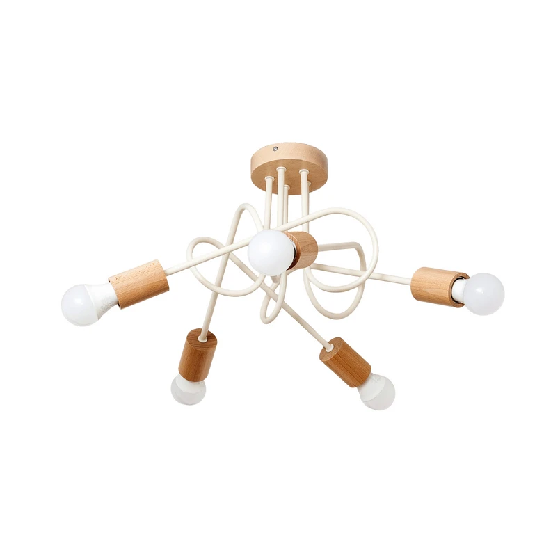 Plafonnier Oxford en combinaison harmonieuse de bois et de métal, à 5 lampes