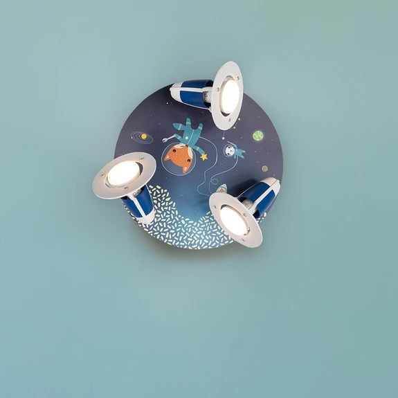 Le plafonnier Space Mission, adapté aux enfants, est l'éclairage idéal dans la chambre des enfants et pour les astronautes en herbe. D'adorables illustrations décorent le panneau du plafond, qui est en bois. Trois projecteurs à double articulation assurent également un éclairage idéal de chaque coin de la pièce. Et pas seulement au plafond, le luminaire de la mission spatiale peut également être monté au mur.