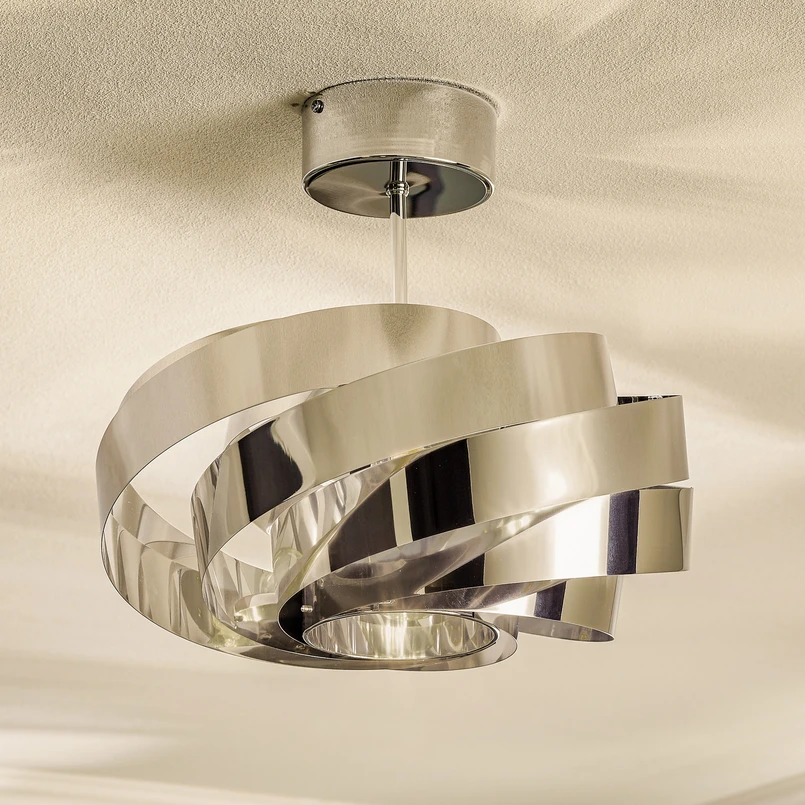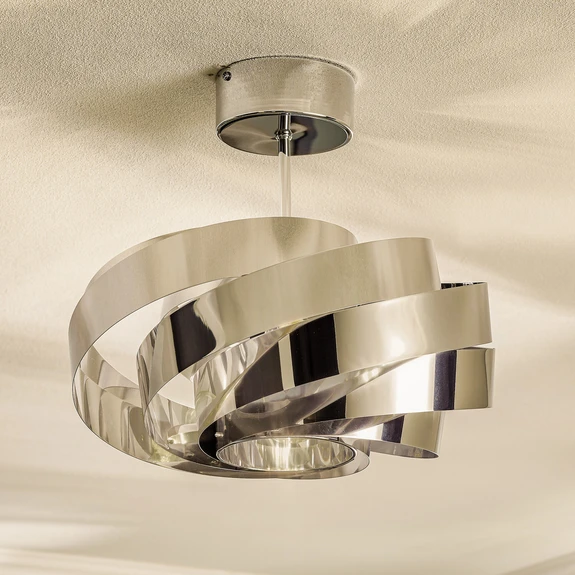 Charmant plafonnier Vento en chrome et nickel Le plafonnier Vento met l'accent sur la conception extravagante de son abat-jour. Des bandes métalliques ont été assemblées en spirale pour former une structure aérienne derrière laquelle les sources lumineuses diffusent leur lumière vers le bas et à travers les espaces de l'abat-jour. Il en résulte un éclairage d'ambiance avec des effets de lumière très particuliers. Les couleurs de ce plafonnier en chrome et nickel s'harmonisent avec de nombreux styles d'intérieur. Peut également être utilisé comme éclairage de table.