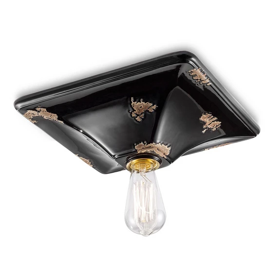 Le plafonnier C136 ne nécessite pas d'abat-jour ni de diffuseur, car il est uniquement constitué d'un corps en céramique. Cela inclut la douille de la lampe, qui est idéalement équipée d'une lampe Rustika avec technologie à filament ou optique à filament de carbone pour maintenir le style de l'ensemble du luminaire. Le C136 est conçu dans un style vintage et donc délibérément taillé pour avoir l'air vieux. Le vernis noir du corps en céramique a été traité de telle sorte que la couleur semble ne pas être complètement nouvelle à certains endroits. Les fabricants de ces lampes rétro ont imaginé et perfectionné ce laquage et cette peinture spéciaux. L'artisanat traditionnel et les anciens motifs et couleurs italiens sont à la base des modèles de ce fabricant, qui produit exclusivement en Italie.