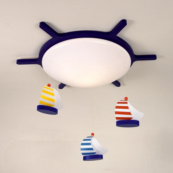 Ce plafonnier en forme de barre de navigation a conservé tout l'esprit de la marine. Trois petits voiliers, bleu, rouge et jaune, sont suspendus à différentes hauteurs. Cet aspect de mobile en fait une lampe particulièrement bien adaptée pour la chambre des tous petits.