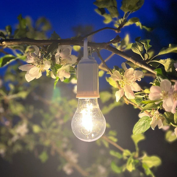Luminaire LED rechargeable décoratif d'extérieur - conçu comme une douille avec une ampoule Ce luminaire LED rechargeable sert d'accent lumineux mobile et décoratif pour l'intérieur et l'extérieur. La structure en plastique se divise en une ampoule claire en forme de poire avec un filament LED à l'intérieur et un boîtier qui constitue la douille. Un crochet facilite la suspension à l'endroit souhaité - trois niveaux de gradation : 40 % / 60 % / 100 % - durée d'éclairage par charge de batterie : 6 à 10 h - durée de charge : 2 h - équipée d'une fonction de minuterie - câble de charge USB-C inclus pour la recharge dans des environnements secs