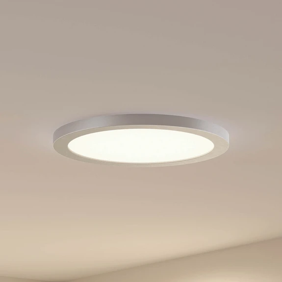 Plafonnier LED rond Aureka, adapté à l'encastrement et au montage en saillie, adaptation de la couleur CCT via interrupteur DIP Aureka marque des points grâce à sa conception multifonctionnelle et à son aspect extérieur sobre. Ainsi, le plafonnier LED s'adapte à de nombreux aménagements et environnements et peut remplir de nombreuses fonctions ou adapter la lumière de manière optimale aux conditions locales. Le plafonnier peut non seulement être utilisé comme plafonnier LED discret, mais il peut aussi être encastré dans le plafond si nécessaire, ce qui lui confère une faible profondeur d'encastrement, car il est très plat. La couleur de lumière des LED peut en outre être adaptée avant le montage. Un interrupteur DIP est prévu à cet effet sur le boîtier et la puissance peut également être préréglée sur trois niveaux à l'aide d'un tel interrupteur. Toutes ces caractéristiques font du plafonnier LED Aureka un distributeur de lumière utile qui, avec sa forme ronde et sa surface argentée, reste agréablement en arrière-plan et peut être utilisé aussi bien dans le domaine professionnel que privé. Le luminaire est livré avec une plaque décorative argentée en forme d'anneau qui peut être fixée magnétiquement en option sur le luminaire afin de pouvoir modifier le design si nécessaire. Diamètre d'encastrement : - Variante 1 (22,5 cm) : 6,5 cm - 21 cm - Variante 2 (33 cm) : 6,5 cm - 31 cm