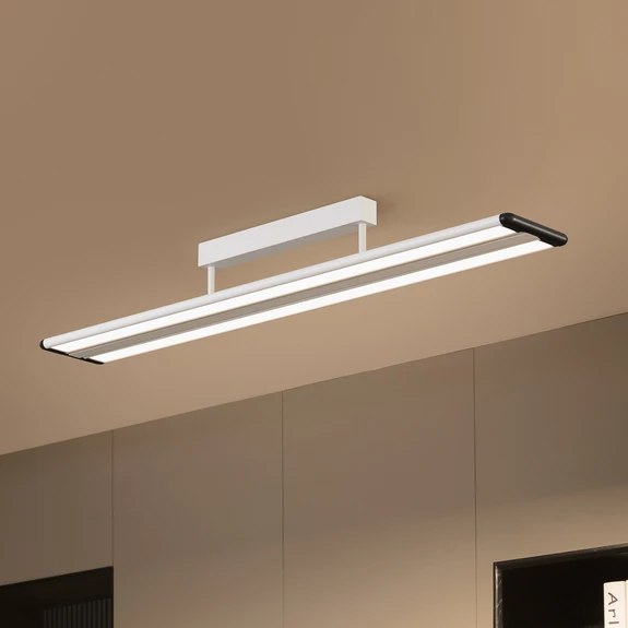 Plafonnier LED de bureau allongé Yuela avec LED à intensité variable et design exclusif Les LED du plafonnier Yuela sont disposées sur deux rangées et éclairent dans une couleur de lumière blanche neutre. La lumière est claire et uniforme et se caractérise en outre par l'absence de scintillement, de sorte que l'on peut travailler longtemps et de manière concentrée à la lumière du plafonnier de bureau Yuela. De plus, les LED sont à intensité variable (DALI) et leur luminosité peut donc être réglée de l'extérieur selon les besoins. Ce plafonnier LED offre ainsi un éclairage de bureau parfait. Le design exclusif est fonctionnel et attrayant et se présente dans un ton argenté discret. - lumière blanche neutre - intensité variable (DALI) - sans scintillement