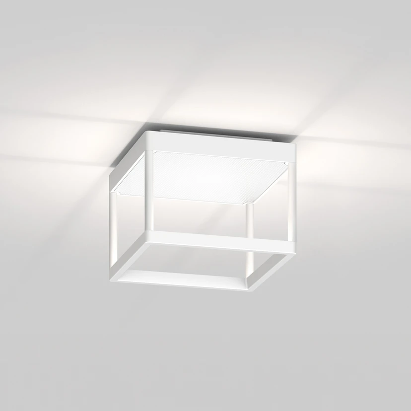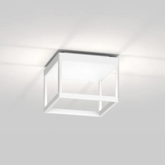 Plafonnier LED Reflex² S, parallélépipède ouvert, 2.700 K, gradation externe par triac, base 20 cm x 20 cmLe plafonnier LED Reflex² S a été conçu par Jean-Marc da Costa, l'un des fondateurs et directeurs de serien.lighting. Son cadre ouvert avec de fines entretoises est fabriqué en aluminium. Les LED sont intégrées sur les faces supérieures des entretoises inférieures derrière un verre plat et rayonnent en direction du plafond, où la lumière tombe sur un réflecteur prismatique en plexiglas.Des LED de haute qualité sont intégrées d'origine et offrent une lumière blanc chaud avec un bon rendu des couleurs. L'intensité lumineuse peut en outre être réglée de manière externe par un triac.